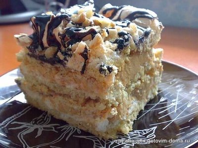 Крем: 200 г. масла взбиваем с банкой варёной сгущёнки Половину крема мажем на первый корж, посыпаем ст.л. рубл.орехов.