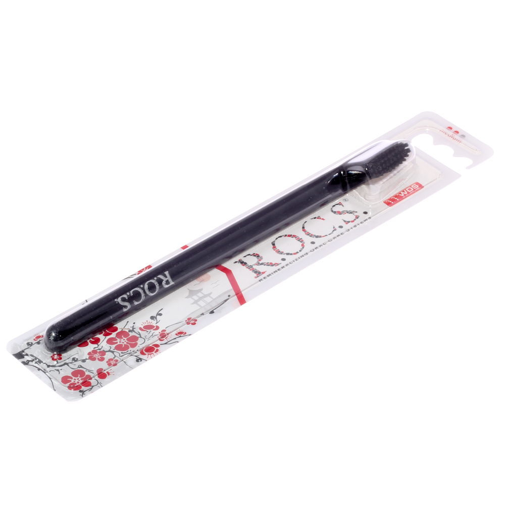 А я недавно купила вот такую щетку Рокс, она полностью черная, даже щетина, очень необычно..никогда таких раньше не видела  Она очень удобная, многоуровневая подстрижка щетины обеспечивает легкий доступ к дальним зубам, а тонкая плоская ручка предотвращает излишнее давление на десны.