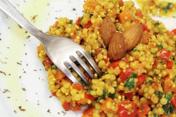 А мне очень понравилась каша кус- кус с овощами и петрушкой С 2 помидоров снять кожицу, мелко на рубить 2 морковки, половину красной луковицы, половину сладкого перца и помидоры. В масле обжариваем 2 зубца чеснока, чеснок потом нужно выбросить. В масло добавляем овощи и тушим, перчим, солим, высыпаем в смесь 300 гр крупы + 1-2 чашки горячей воды, тушим 10 минут на медленном огне, добавляем зелень. Очень вкусно с бараниной и курицей