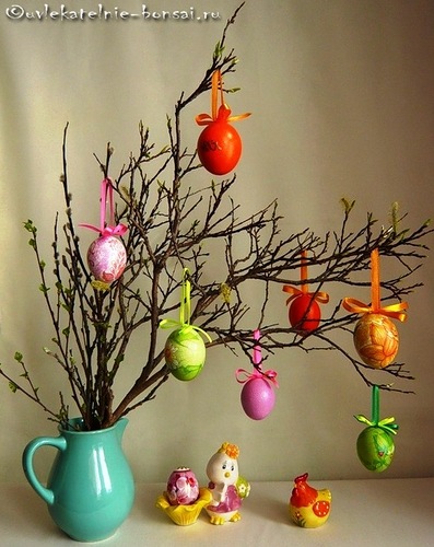Подруга в прошлом году делала с ребенком пасхальное дерево. Насобирала заранее целых пустых скорлупок из-под яиц, покрасила их. В вазу с водой поставила ветки с дерева, они естественно в теплой комнате через пару дней попускали салатовые листочки, и на эти ветки потом на ленточках повесила покрашенные яйца. Получилось очень симпатично. Думаю, может и себе что-то такое сделать.