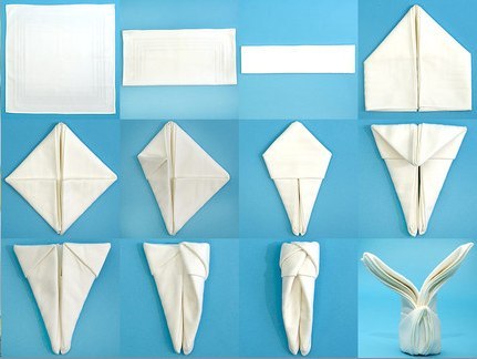 А я сегодня купила очень красивые салфетки на стол на Пасху. А у кого есть тканевые , то можно сложить в виде вот таких прикольных зайцев.