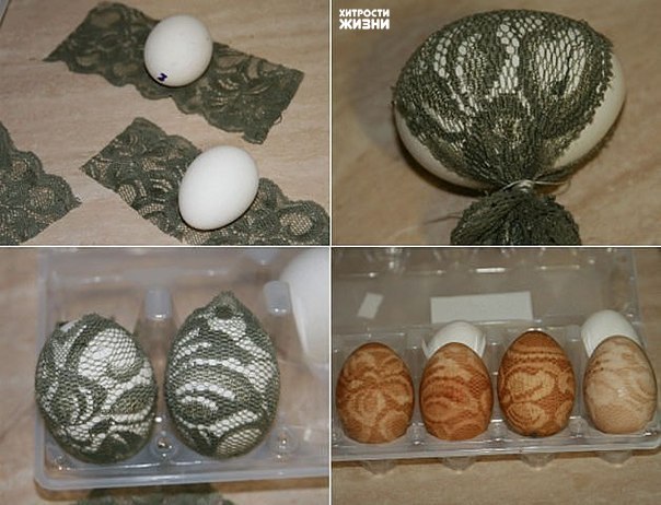 olexandrivna писал(а): Ще ось таким досить простим способом можна незвичайно пофарбувати яєчка, кладете в посудину подібну і потрішки доливаєте води і ось що виходить))) Интересная задумка!!! А еще можно сделать кружевные яйца. Тоже вроде не сложно. Обвязываем вареные яйца в кружевную ткань и опускаем в раствор с красителем.