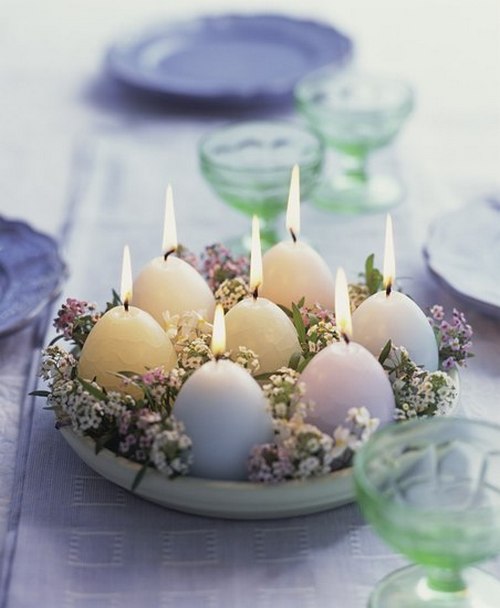 А мне понравилась эта композиция из свечей в виде яиц. Видела, что такие свечки уже продаются. Надо будет купить несколько штук (возможно ароматизированных) и сделать с помощью цветов и веточек что-то похожее.