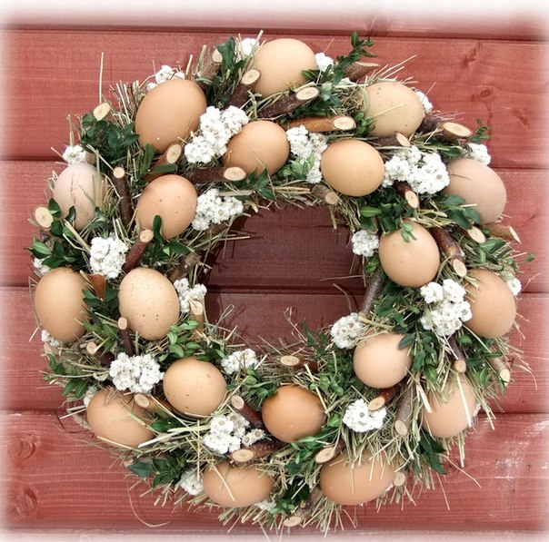 Очень интересно выглядят яйца с листочками! А я нашла еще идеи для пасхального венка: