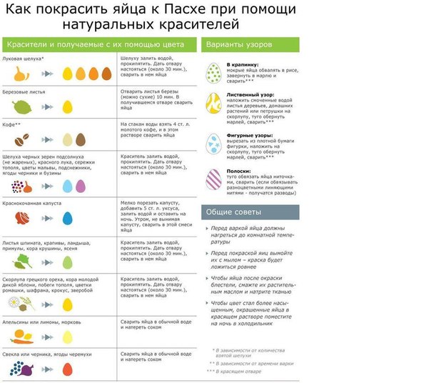 Для тех, кто хочет покрасить яйца натуральными красками в данной табличке наведено много примеров, что можно использовать и какой цвет должен получиться.