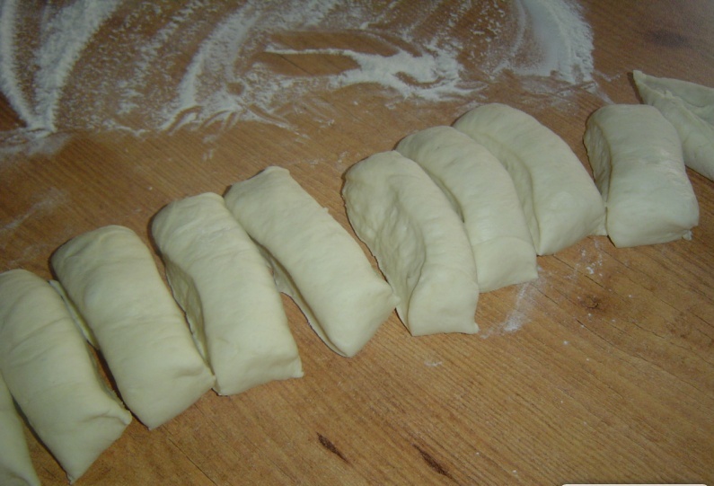 Каждый кусок теста раскатываем в тонкие прямоугольные пласты, на один край кладем сыр, а второй край надрезаем, как показано на фото. Затем сворачиваем рулетик (не плотно), начиная с края, где находится сыр, и защипываем края. Вложение: