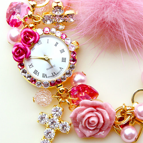Сам циферблат часов очень симпатичный, но браслет из розовых розочек, крестиков в камушки мне кажется немного детским. Слишком много всего.