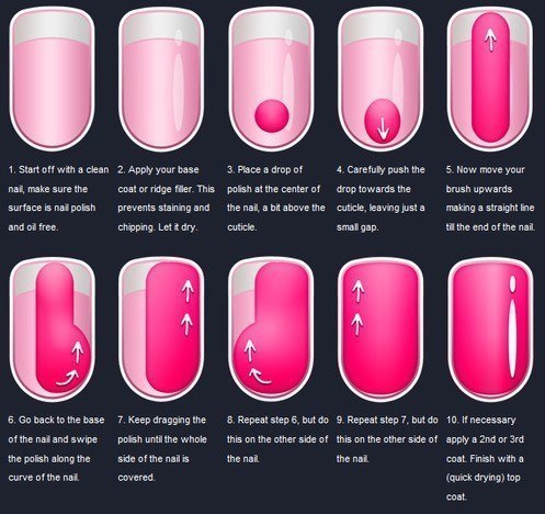 чаще всего у меня на ногтях темные цвета и я тоже по этой схеме крашу,получается ровно и красиво.главное высидеть спокойно и не влезть никуда пока сохнет лак)