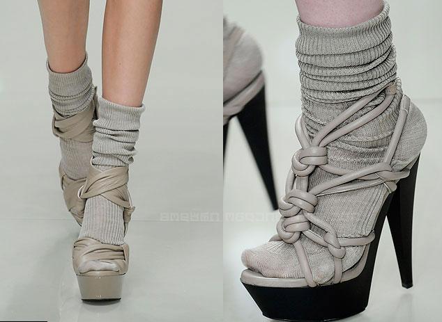 Босоножки красивые, но с носками..Думаю, что этот прикид можно надеть только на подиум, в реальной жизни вряд ли кто-то осмелится выйти на люди! Я люблю носить классику, шпильку на высоком каблуке. Маленькая ножка смотрится очень сексуально!  Купила себе такие на новогоднюю вечеринку. Ну очень высокий каблук, еле выходила, но оно того стоило. Взгляды мужчин были прикованы к моим ногам!