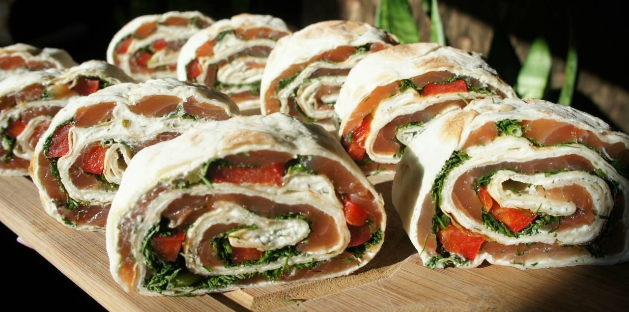 А как такие шашлыки вообще кушать? Я люблю лаваш и рулеты из него, особенно нравится с красной рыбой. Нужно намазать лаваш творожным сыром (125 гр), сверху положить рыбку кусочками, потом посыпать нарубленной зеленью, далее выложить тонкие полосочки болгарского перчика, снова накрываем лавашом и намазываем его творожным сыром. Скручиваем все в рулет, заворачиваем в пленку и в холодильник на 2 часа.