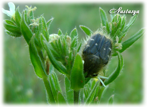 Жучок облюбовал стебель, если присмотреться, можно увидеть, что жук не обычный, а слегка мохнатенький