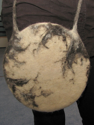 Смотрите какая необына валянная сумочка!Честно говоря она меня напугала.расцветка такая странная.... Из-давлека смотрится как будто кусок то ли коровы, то ли свиньи!)))Кругая форма тоже придает сумке пикантности... Я бы такую наверное ни за что не одела, хотя доля таланта в ней зарыта однозначно...