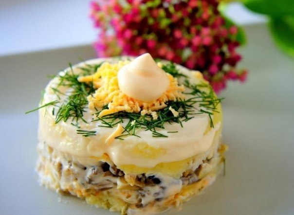 Куриная грудка - отварить, 2-3-яйца отварить, 6-8 шт. чернослива, грибы поджарить, все нарезать и смазать майонезом.