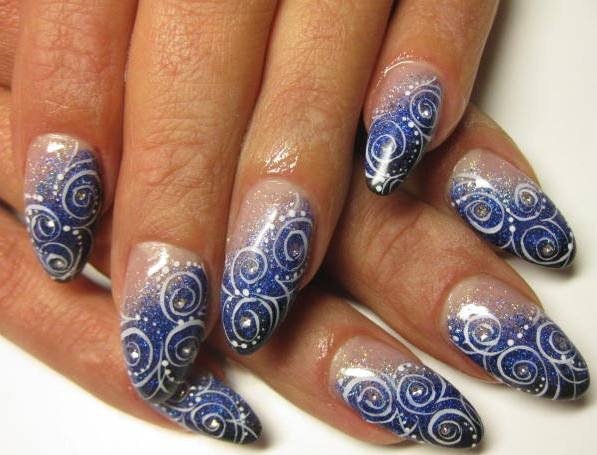 Мне очень понравились голубые ноготки в посте Жаклин, а еще вот такой маникюрчик не плох, но по моему завитки не так и интересны, можно придумать роспись покрасивее и поинтереснее