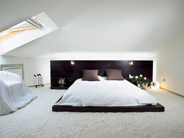 Люблю минимализм во всем...И в интерьере))Вот такая неплохая спальня.но она вроде как на чердаке чтоль..)))