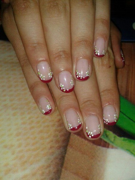 Ирена писал(а): Я еще очень люблю френч с блестками, особенно когда нужен праздничный маникюр, так такой самый раз, вроде и не сильно вызывающе и с намеком на праздничность))) Да и вариантов столько с этими блестками, что просто не можешь решить какие же выбрать) Пару лет назад постоянно рисовала себе черный френч и такие цветочки белые, правда их клеила, так как не могла красиво нарисовать;) Я такий варіант уже робила, правда колір клієнтка захотіла змінити на бордовий, а квіточки такі ну дуже легко намалювати дотсом, самий простий і легкий для всіх спосіб, ви маєте його?