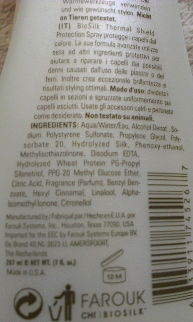 Я выпрямляла волосы с ее помощью три раза.Я пока не могу ничего сказать.Разве что то,что распылитель оч удобный и мелкий.НО ,что меня удивило.Покупая термозащиту за такие деньги,я не рассчитывала,что на втором месте в составе после Aqua/Water/Eau будет идти Alcohol Denat. Я-то и купила средство только потому ,что читала в описании на сайтах,что спирта там нет. 2.Biosilk Smoothing Solution Solution Lissante В описании говорится,что это разглаживающее средство для вьющихся волос с термозащитными свойствами при горячей укладке. Вот хоть тут спирта нет. Пользовалась один раз и мне кажется,что выпрямление происходит более мягче ,чем с Thermal Shield
