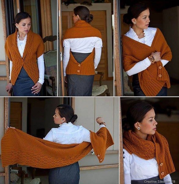 Зефирка писал(а): И я хомуты люблю, у меня два разных, черный и рыжий, ношу всегда, всю зиму напролёт, а весной перехожу на шарфы, их у меня множество. Увидела еще вот такой вариант шарфа-жилетки, интересная задумка Здорово! Обязательно такой свяжу: можно много накрутить на шею и утеплиться и безрукавка тоже классно смотрится. Заодно и тепло.