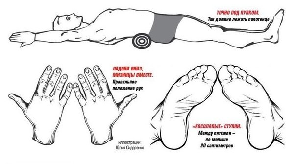 Прочла о японском методе избавления от обвислого живота, нужно скатать валик из полотенца, длина не меньше 40 см, диаметр валика 7-10 см, теперь нужно лечь на пол положив валик под поясницу, как раз на против пупка. Ноги на ширине плеч, стопы нужно косолапо свести вместе, чтоб пальцы соприкасались, а пятки были на расстоянии 25 см друг от друга. Вытянутые руки заводим за голову, ладонями вниз, чтоб соприкоснулись мизинцы, в таком положении лежим 5 минут Если выполнять упражнение ежедневно, то результат появится через месяц. А какие упражнения знаете вы?