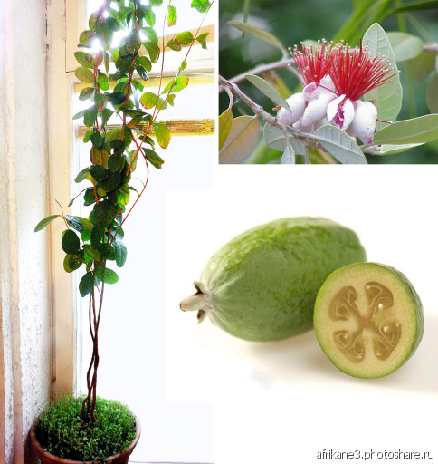 В домашних условиях можно вырастить фейхоа.При правильном уходе это растение очень декоративно, особенно в период цветения, когда покрывается розово-белыми цветками с большим количеством кораллово-красных тычинок. Цветёт фейхоа в конце весны – начале лета.