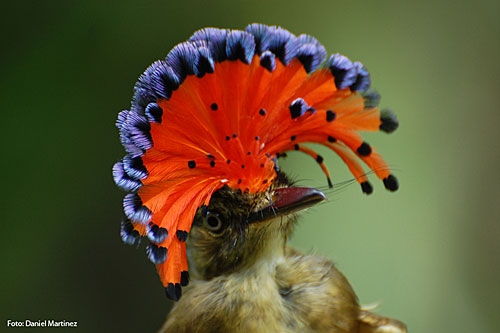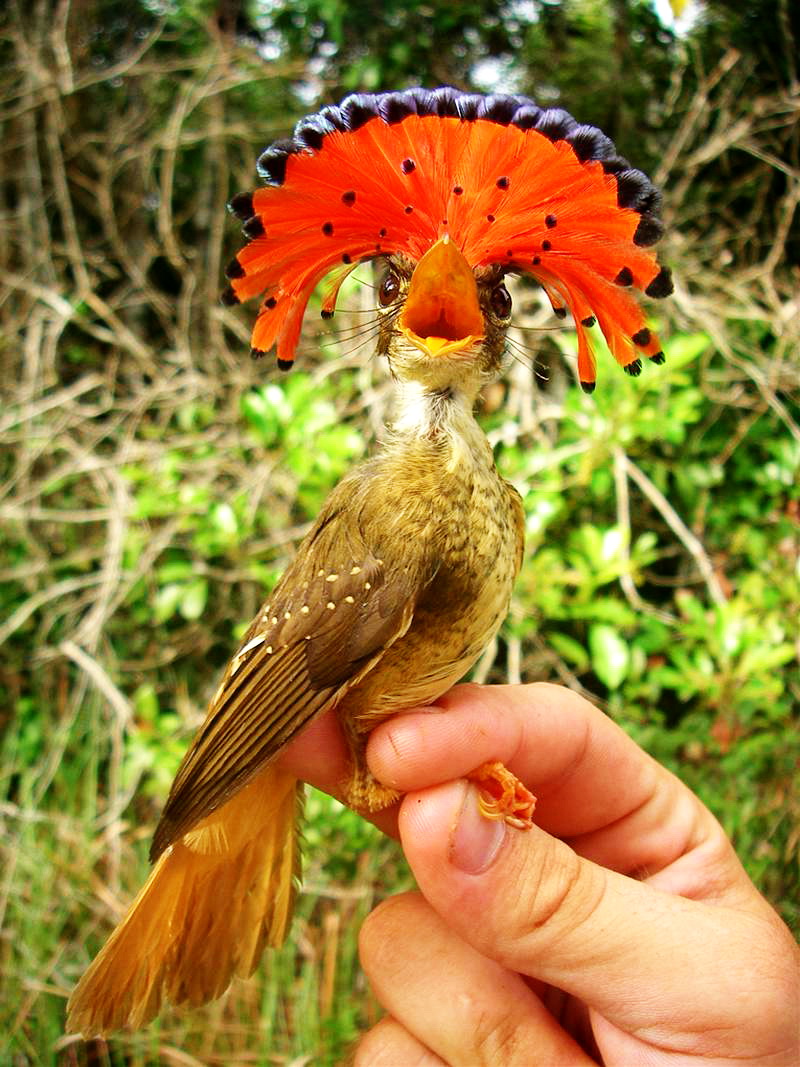 А как вам Венценосный мухоед? Шикарные веер, неправда ли? Обычно этот веер сложен и на голове у птички выглядывает всего несколько ярких перышек. Но в случаях опасности или игр с противоположным полом веер распускаеться вот таким дивным образом.