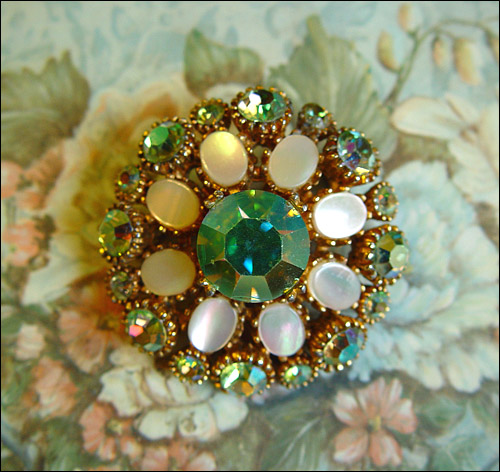 ВОт такая винтажная брошечка тоже очень понравилась... фантазийная такая..От нее веет каким-то теплом. Думаю она красиво будет смотрется на одежде например белого или постельных цветов. Возможно даже на ярко-зеленой.