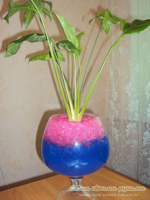 Азалия писал(а): Очень красиво но мне жаль растения, ведь они привыкли к натуральной земле а не химии. Да нет, гидрогель растениям не вредит, лучше, конечно, его добавлять в почву при посадке, а не так, как на фото-садить растение только в шарики гидрогеля. Он будет и предотвращать пересыхание почвы, а ещё и от её переувлажнения. Кстати, можно срезанные цветы тоже ставить в стеклянную вазу не в воду, а в такие шарики гидрогеля!