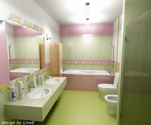 Ну небольшая ванная тоже может быть красивая...Вот здесь дизайнер напрммер не располагали большим помешением, но за счет того, что плитка светлая и все равмотно продумано, помещение выглядит красиво. А сочетание розового и салатового смотрится так по-весеннему нежно!