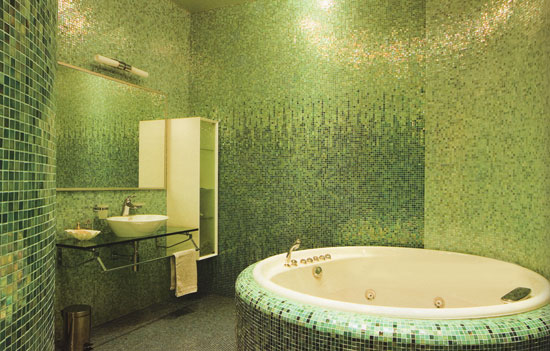 А мне понравилось. Сочетнаие красного с черным как всегда шикарно...Ну а белый потолок, белый умывальник - это немного разбавляет мрачность ванной. Мне кажется очень симпатично! А вот такая своеобразная оливковая ванная - из мельчайшей плиточки. Смотрится очень интересно, как чешуя зеленой ящерицы или змеи, что-ли. Интересное, где така мелкая плитка берется?