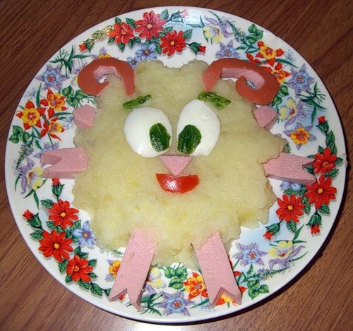 Вариант пюре с колбаской в форме Смешарика мне очень понравился. Моя дочка очень любит смешариков и картошку, думаю, что ей такое понравится