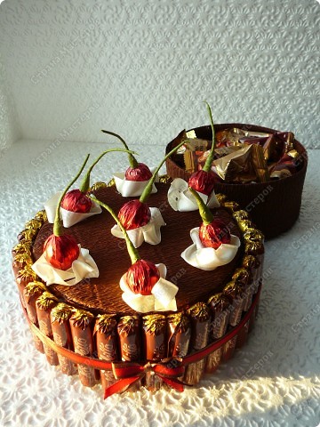 Как прикрепить конфеты: Для этого потребуется двухсторонний скотч. Делаем из него один или несколько кругов на коробке. И приклеиваем конфеты "швом" к липкой ленте, не оставляя между ними зазоров. Надо аккуратно, и в одном направлении. Потом обвязать красивой декоративной лентой. Как сделать вишни: Понадобится круглые конфеты в красных обертках под цвет вишни (желательно с одним хвостиком), тонкая проволока и флористическая лента зеленого цвета. К хвостику конфеты прилаживаем кусочек проволоки и обматываем ее флор.лентой, захватывая и хвост обертки конфеты. Флористическая лента (ее еще называют тейп-лентой) - это лента, которая применяется для обмотки сухих цветов, деревьев из бисера, топиари. При небольшом натяжении она растягивается и от теплых рук становиться немного липкой. Ее стоимость около 10 грн.
