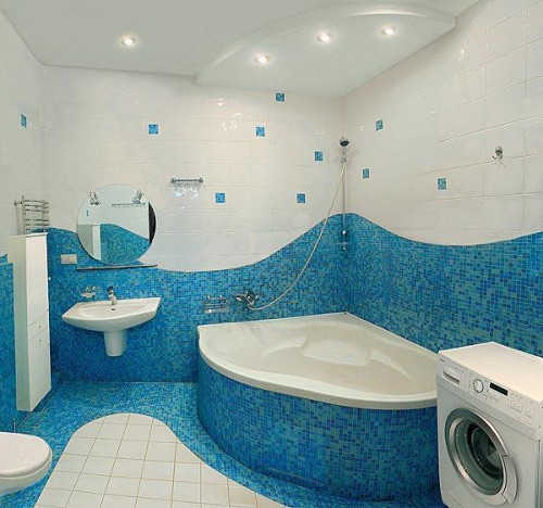 Всегда думала, что очень красиво смотрится в ванной комнате мозаика в голубых тонах. Но видимо далеко не все оттенки голубого создают красивый и стильный дизайн. Некоторые честно говоря смахивают вообще на басейн.