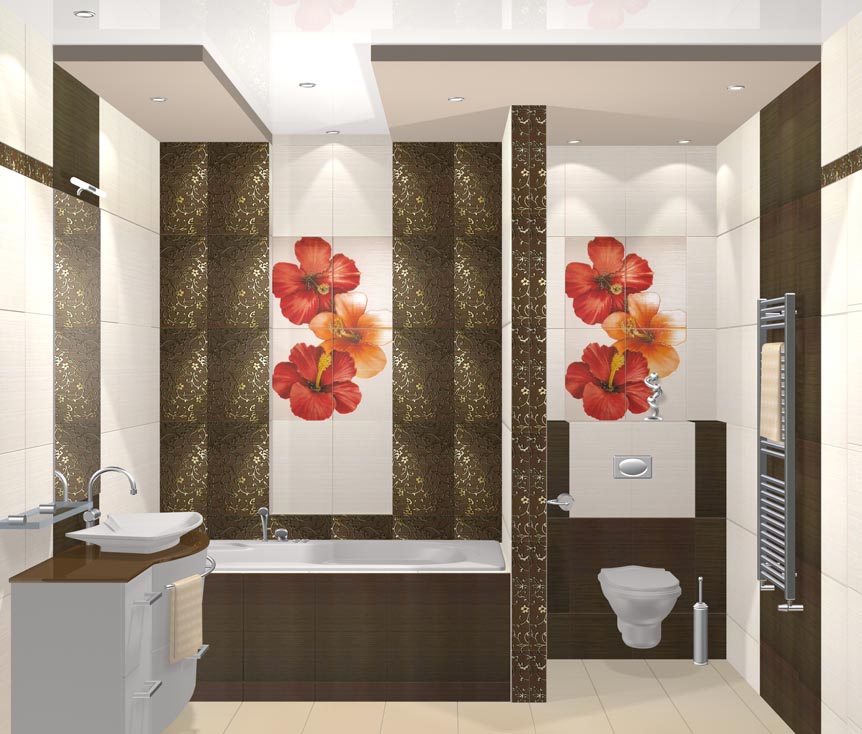 Понравился дизайн ванной комнаты в коричневых тонах. Вроде плитка и темного цвета и ванная должна казаться мрачной, но за счет светлых вставок с яркими цветами, сразу меняться ощущения. Как вам?