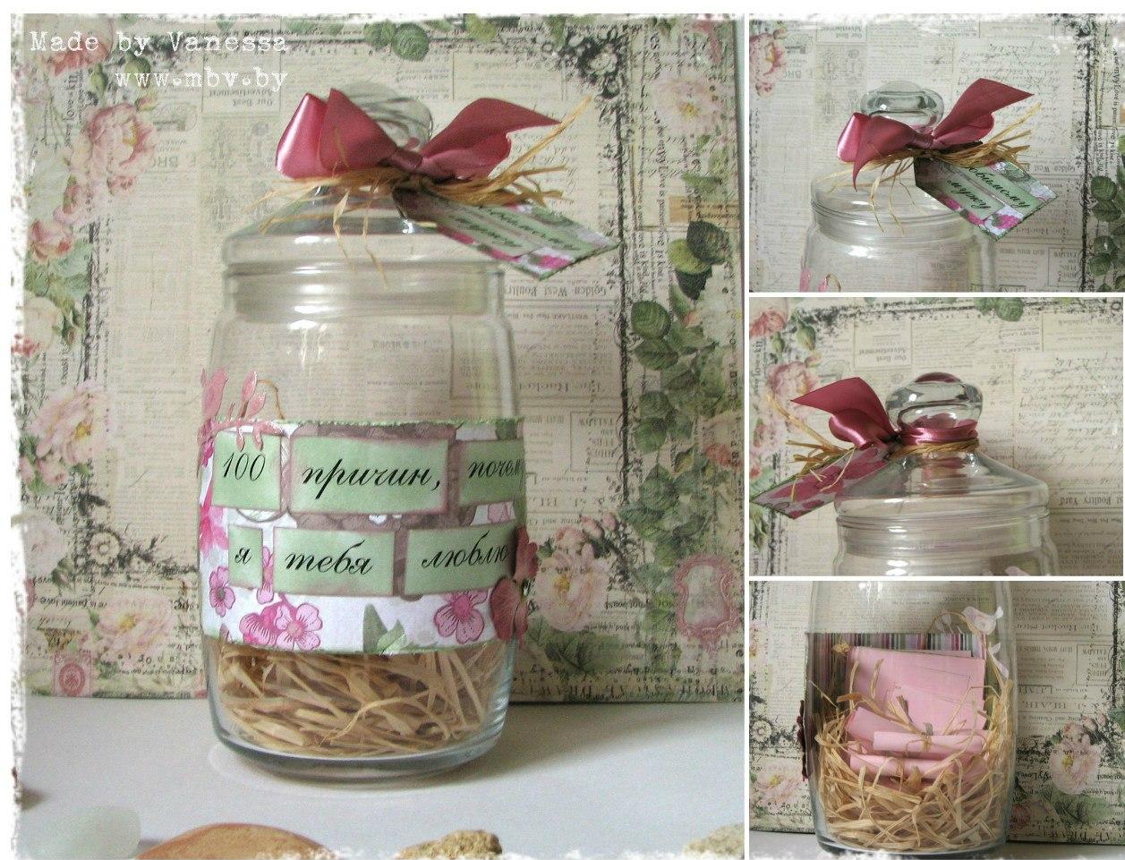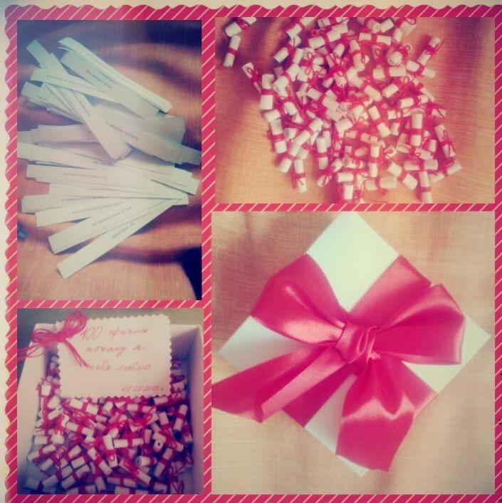 у меня подруга на 14 февраля для любимого решила сделать вот такой подарок,только она написала 50 причин и красиво оформила баночку)внешне очень симпатично и интересно смотрелось..думаю всем было бы приятно получить такой подарок) или можно сложить сердечком)