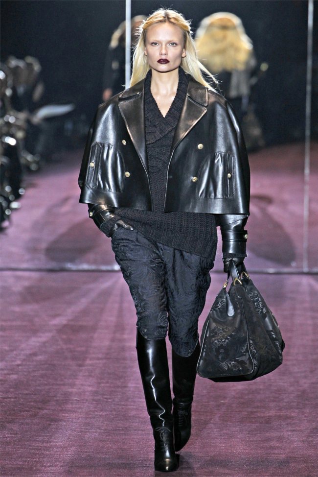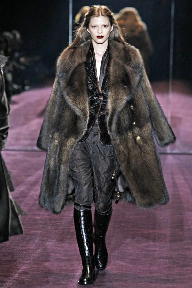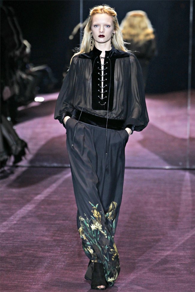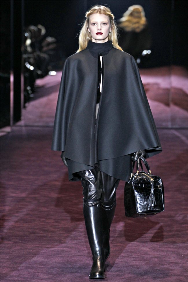 Неделю моды осень-зима 2012-2013 в Милане открыл показ Gucci. Дизайнер бренда представила пальто и куртки в стиле милитари, удобные сапоги на низком ходу, в которые дизайнер советует заправлять брюки-галифе. Для вечернего выхода Gucci представил шикарные платья в пол.