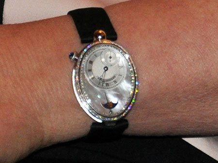 Годинник Breguet Reine de Naples виготовлено з 18-каратного білого золота. Безель з обробкою 128 діамантами (близько 0,83 карата).