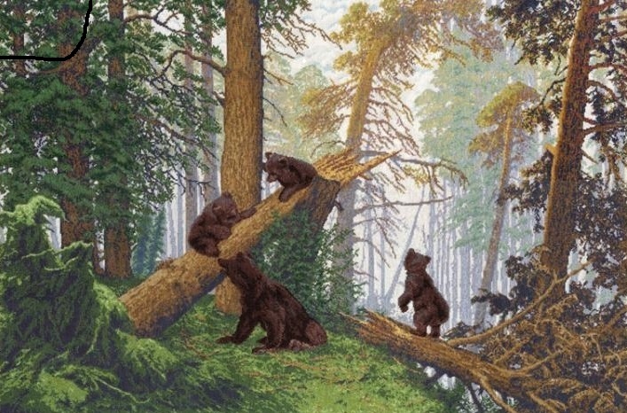 У меня тоже эта картина - это воспоминания из детства. Был такой коврик у бабушки. А еще мне запомнились конфеты вафельный Мишки... Там на обертке тоже была такая картинка)))) А я уже приступила к вышивке. Сложно, это не то слово Крестики не просто маленькие, они мини-маленькие.... Много одиночных крестиков. Схема черно-белая - все сливается в глазах. Уже купила цветные фломастеры, будут разукрашивать, чтоб легче было.