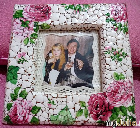 Я когда видела в продаже фоторамки сделаные с яичной скорлупы и салфеток для декупажа. Выглядели очень симпатично. На подобе вот таких. Вложение: