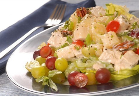 Ингредиенты: яйца — 3 шт. куриное филе — 300 г яблоки зеленые — 2 шт. виноград — кисть соль — по вкусу сыр твердый — 150 г майонез Рецепт приготовления: Яйца и филе отварите. Нарежьте кубиками. Сыр и яблоки тоже нарежьте кубиками. Виноградинки разрежьте пополам. Соедините все подготовленные ингредиенты, заправьте майонезом и аккуратно перемешайте.