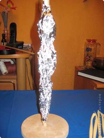 Девочки, я просто в восторге от такой вещицы, может кто делал что-то подобное уже? Что б сделать такую красоту нам нужен термопистолет, деревянная стойка, самотвердеющая масса, ленты, ткань, проволока, фольга и разные украшения. Из проволок нужно сделать заготовки: 5 палочек по 10 см и 2 по 5, на них мы будем вешать украшения. Берем кусочек фольги в 60 см и оборачиваем ее вокруг деревянной заготовочки, придав ей форму женского тела, лучше немного приклеить ее термопистолетом. Вложение: