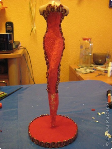 Через сутки проволоку можно временно вынуть, чтоб не мешала и нужно обточить манекен наждачкой, чтоб был гладенький, после этого окрашиваем верхнюю часть в телесный цвет, а низ в цвет платья Вложение: