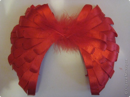 Крылья вырезаны из пластиковой бутылки, перья из атласной ленты, чтоб они были загнуты вниз нужно свернуть ленту в рулон и положить на батарею, чтоб зафиксировать. Ленты понадобилось около 6 метров Вложение: