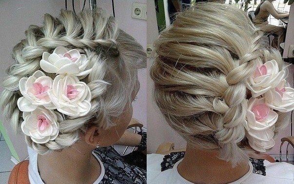 Эти цветы очень красиво смотрятся на фоне этой прически, я бы сказала хорошо ее дополняют.