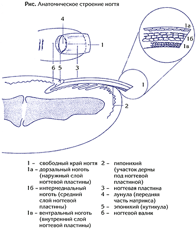 1.Гипонихий. Это кожа под свободным краем ногтя. Он состоит из эпидермальной ткани и формирует водонепроницаемый слой, защищающий ногтевое ложе от проникновений бактерий и вирусов. Если гипонихий нарушен возможно проникновение инфекции.