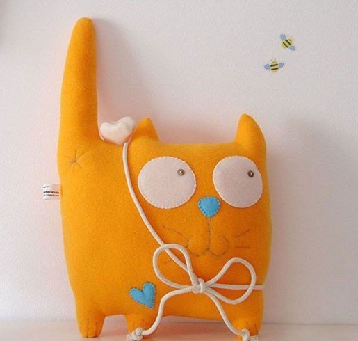 Нашла простенькую выкройку игрушки из фетра - вот такого симпатичного влюбленного котика. Потребуется фетр двух цветов, нитка, ножницы, вата или синтипон. Необходимо вырезать из фетра 2 детали туловища. С фетра другого цвета вырезать мелкие детали. К одной из сторон туловища пришить нос, глаза, сердечко. Повышивать реснички-усики. Сшить две стороны туловища между собой, оставим небольшую дырочку, чтобы вывернуть. Наполнить ватой и зашить до конца. Можно украсить ленточкой или другими аксессуарами.