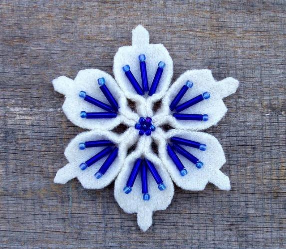 Можно сделать на новогоднюю елку снежинки с фетра. На бумаге рисуем шаблон "лепестка" снежинки и вырезаем. С помощью шаблона вырезаем из белого фетра шесть одинаковых "лепестков". Склеиваем или сшиваем их между собой. По желанию декорируем цветными нитками и бисером. Можно также сверху попрыскать лаком для волос с блестками.