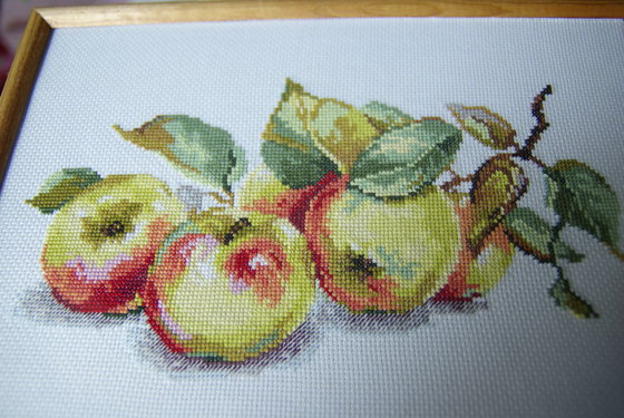 Еще одна вышитая крестом картина для кухни в стиле гжель. На этот раз с яблоками. Вложение: