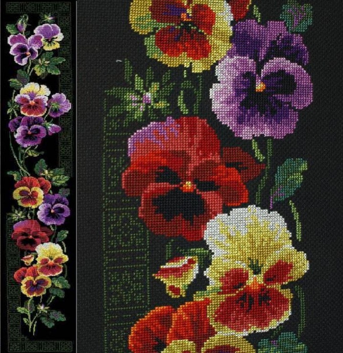 Что-то я в последнее время увлеклась вышивкой крестом Риолис - мне очень нравятся их картины с цветами. Например, у них есть целая серия вышитых цветочных панелей. Есть на черной канве, а есть на белой. Мне очень нравится с анютиными глазками: Вложение: