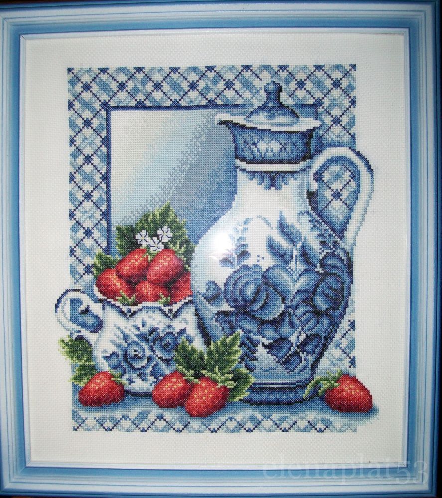 Мне тоже нравится гжель. Красивые вышивки и букета, и натюрморта с персиками. У меня есть схема для вышивки натюрморта на кухню гжель с клубникой. Еще есть в пару с грушами. Вложение:
