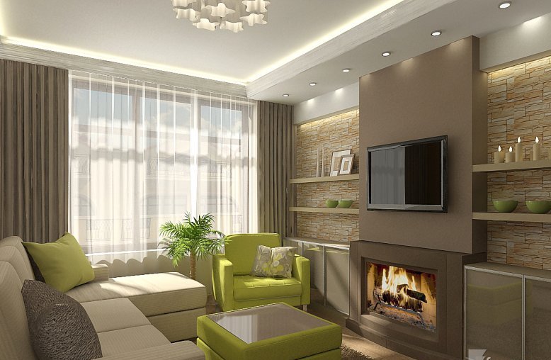 А вот нижнее фото - это красота... Спокойные тона, мягкая мебель, большое окно, вазон, камин и декор стенки камнями - все в меру и так стильно. Если гостинная в квартире нормального размера, очень будет красиво.
